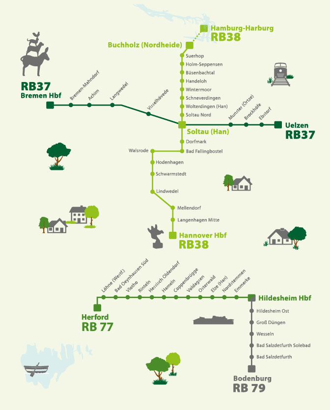 Dazu gehören die Verbindungen von Magdeburg nach Wolfsburg, in den Harz (Halberstadt, Thale, Blankenburg, Goslar), nach Erfurt, von Halle nach Goslar, von Dessau nach Aschersleben, von Stendal nach Wolfsburg sowie die Strecke zwischen Naumburg und Wangen.